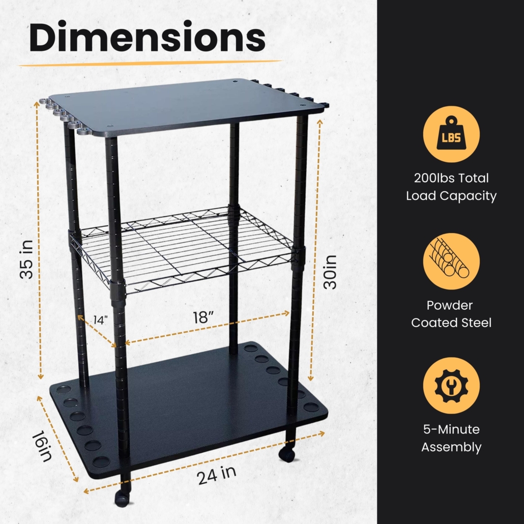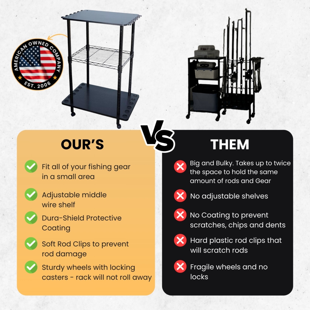 - Tailored Storage Solutions: Our adjustable wire shelf has space for your tackle box, rods, poles and more. Glides effortlessly on smooth rolling casters. From fishing rods to tackle, keep everything in its place with our versatile fishing cart.