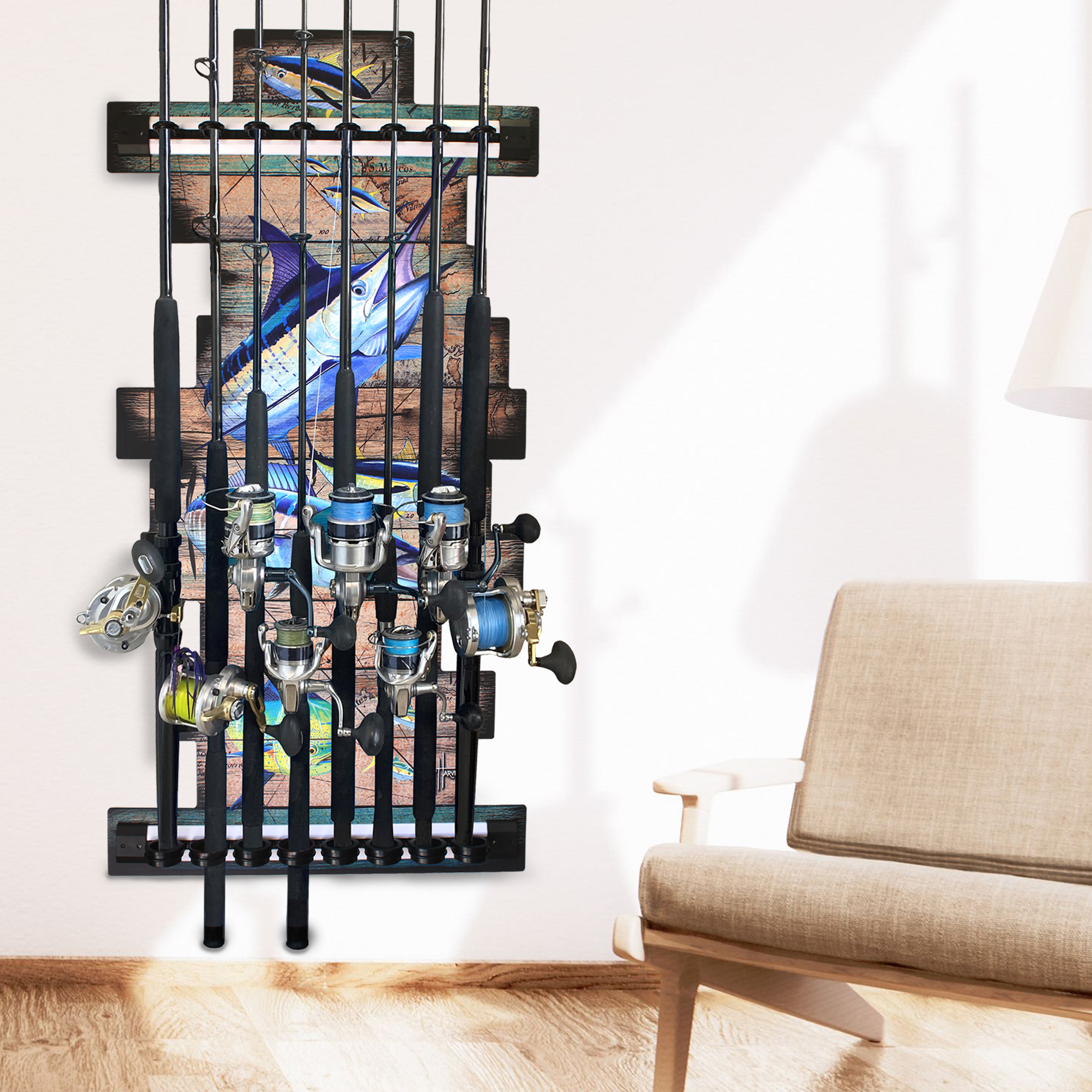 - Optimize Your Fishing Space: Keep up to 12 freshwater rods neatly organized in your garage or fishing storage unit. Easy access to your essential fishing gear. Spend more time fishing, and less time organizing with this fishing rod holder.