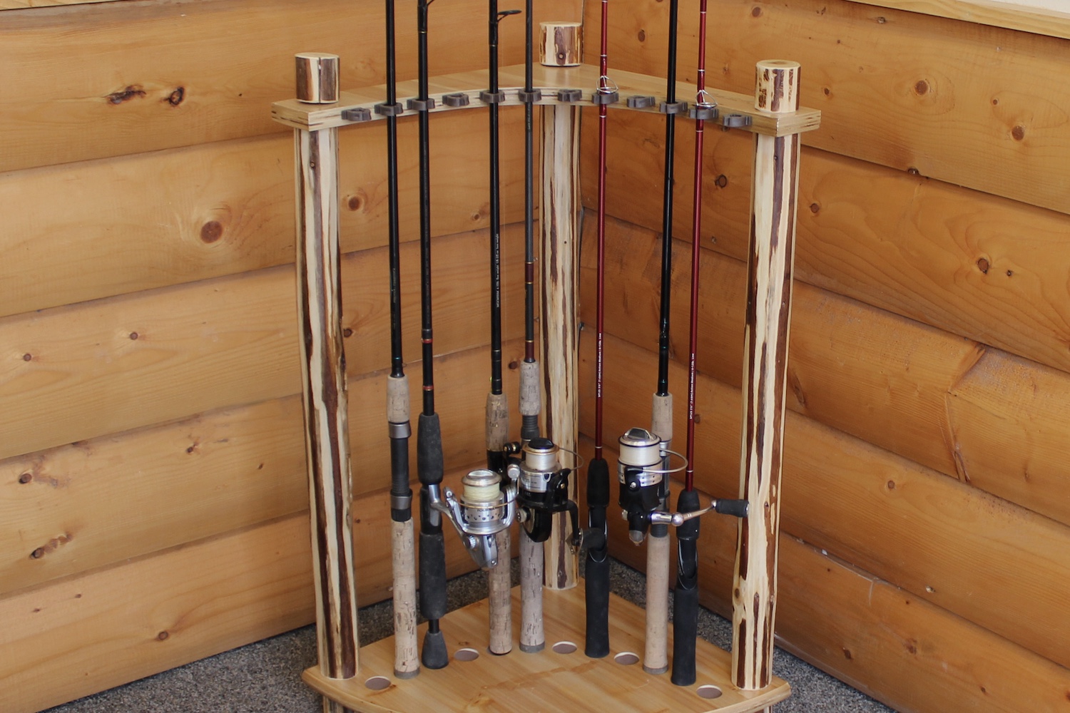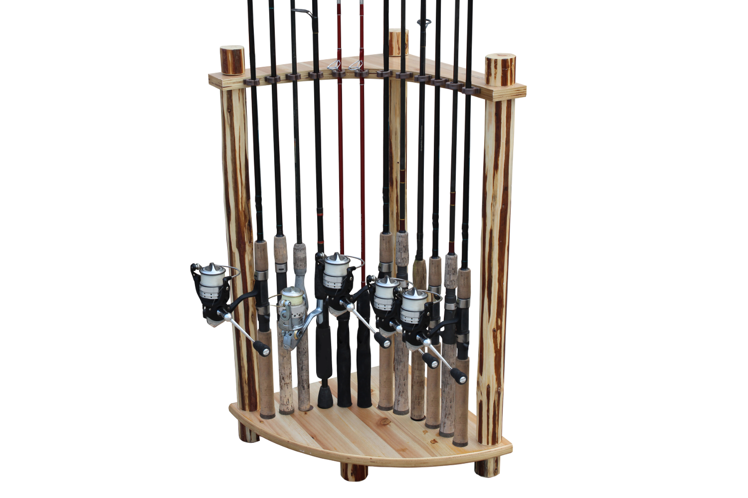 Keep your fishing gear organized with this rustic solid pine corner rod rack. Holding up to 12 freshwater rods, it features a unique skip-peeled finish, space-saving design, and durable scratch-resistant coating. Easy to assemble with no tools required, it’s the perfect blend of function and charm.