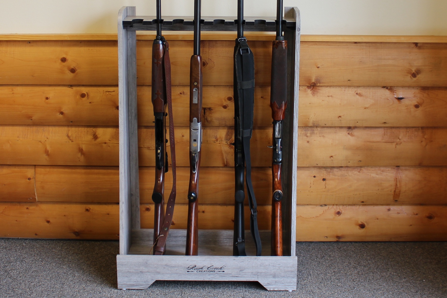 Keep your rifles and shotguns organized, protected, and ready to show off with the Rush Creek Creations 8-Rifle/Shotgun Floor Rack. With deep-groove angled rests, padded supports, and a solid cross-braced base, this oversized rack is as sturdy as it is stylish. The natural Barn Wood laminate adds rustic charm, making it perfect for any home, cabin, or lodge.