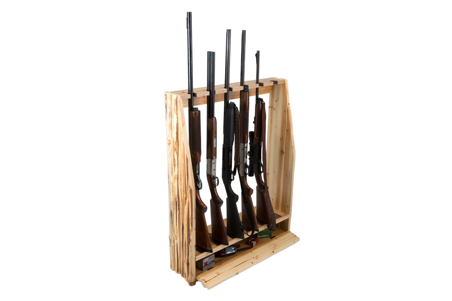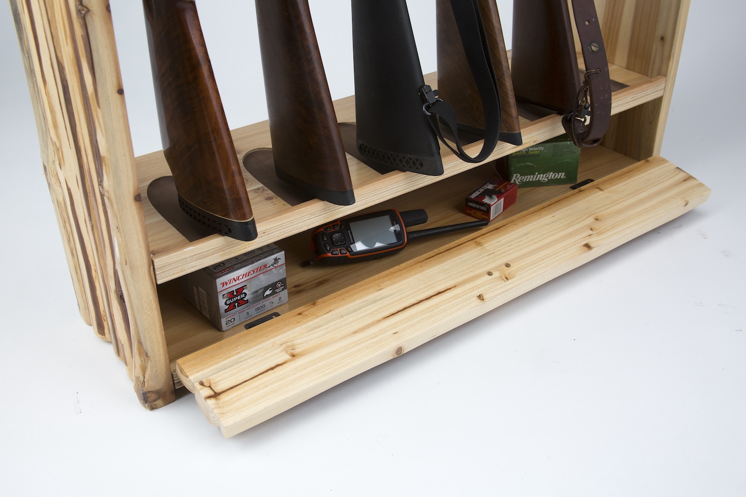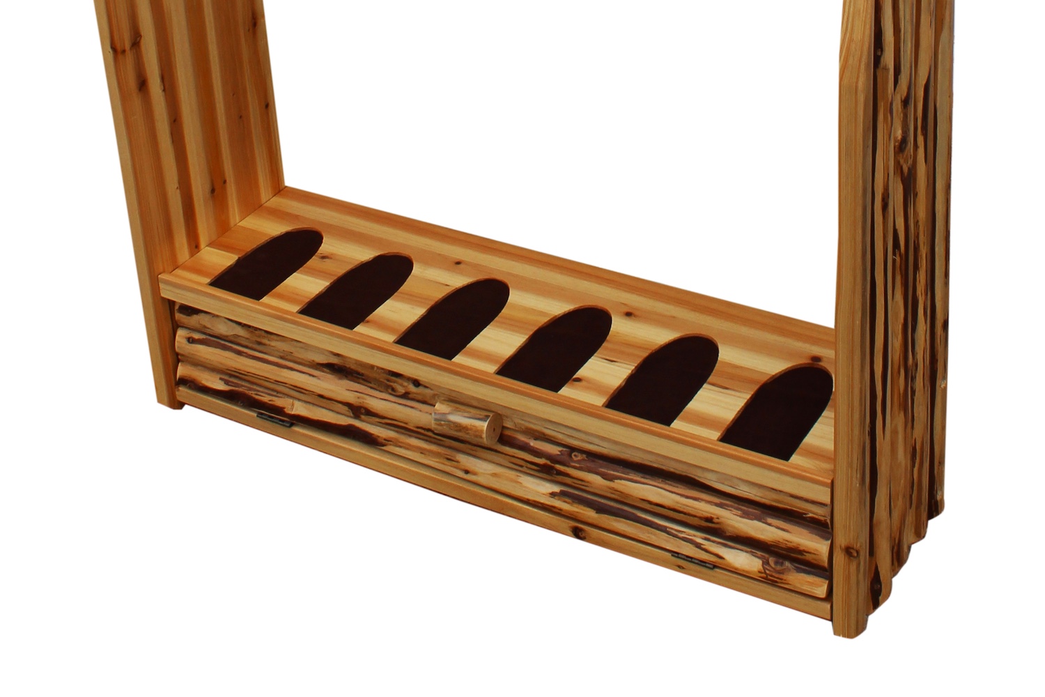 Maximize your hunting storage with the Rush Creek 6-Gun Wall Rack. Designed to hold six rifles and featuring a convenient drawer for ammo or accessories, it combines functionality with rustic style. Built from solid pine with heavy-duty side panels and a skip-peeled finish, this rack keeps your collection secure, accessible, and ready to display.